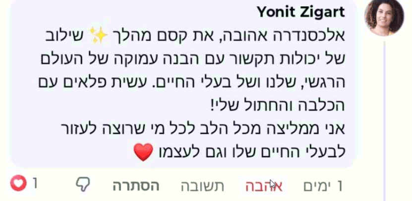 המטרה שלי היא להביא לריפוי עמוק, איזון ושמחת חיים לכל חיה, מתוך הבנה ותקשורת עמוקה.